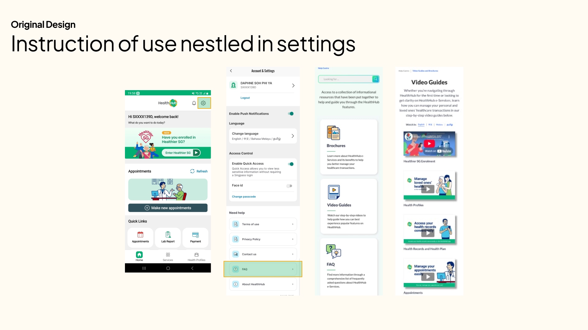 While instructional content like video guides and FAQs are available in HealthHub, they’re buried within the settings and require users to actively seek them out. For older adults, this passive form of help isn’t enough.