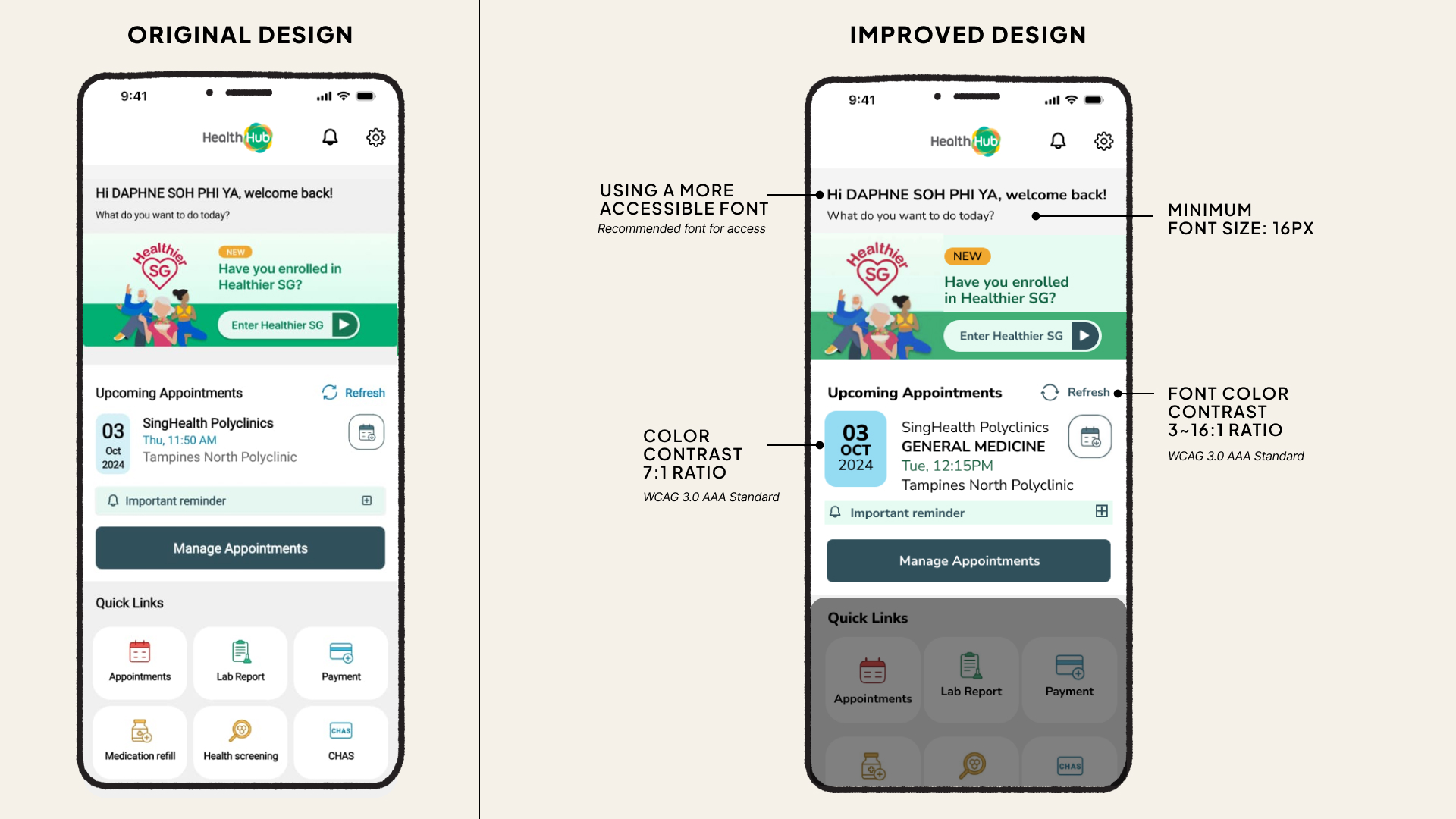 By making the app more accessible, we empower more Singaporeans to take control of their healthcare, enabling them to fully benefit from what HealthHub has to offer. This inclusivity helps bring more people to the pinnacle of healthcare management, ensuring that everyone, including those with varying abilities, can access and benefit from the system.