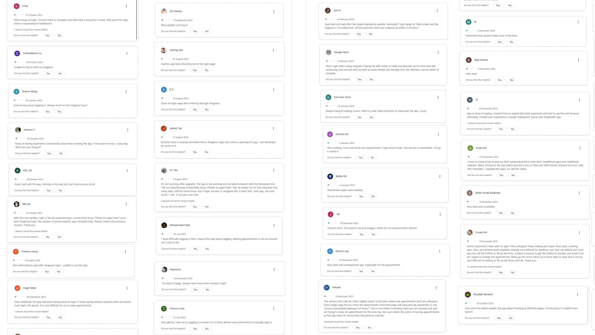 Through secondary research—particularly app store reviews and forum discussions—I observed recurring complaints about app downtime, login errors, buggy form submissions, and appointment unavailability. These issues not only frustrate users but also diminish confidence in HealthHub’s reliability, especially for those already hesitant to rely on digital services for critical tasks.
