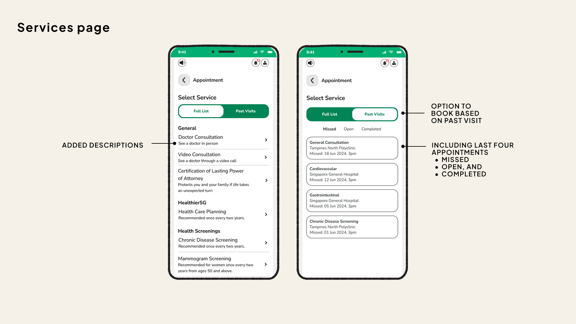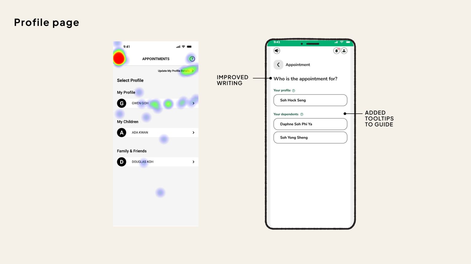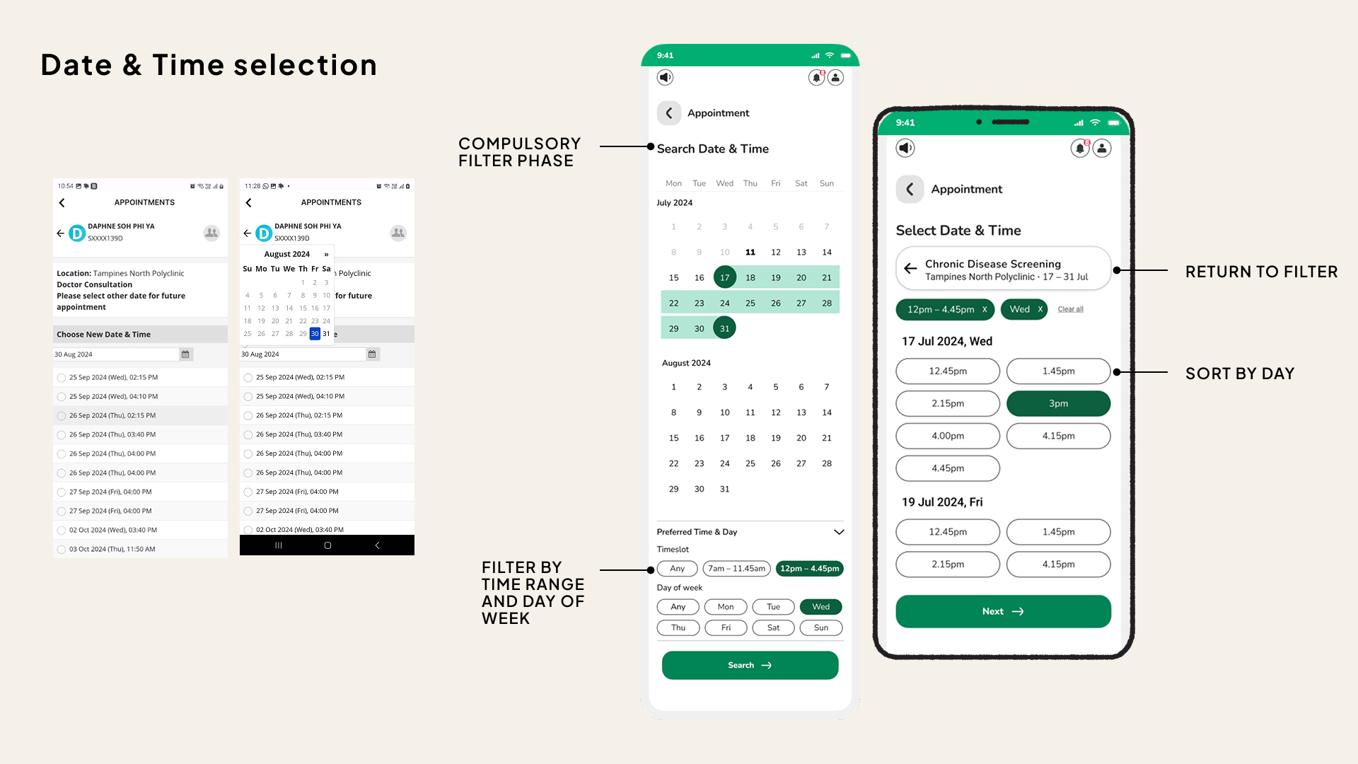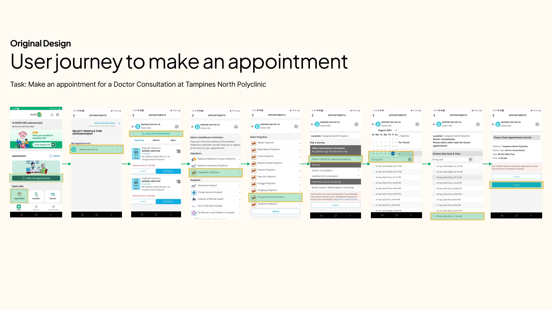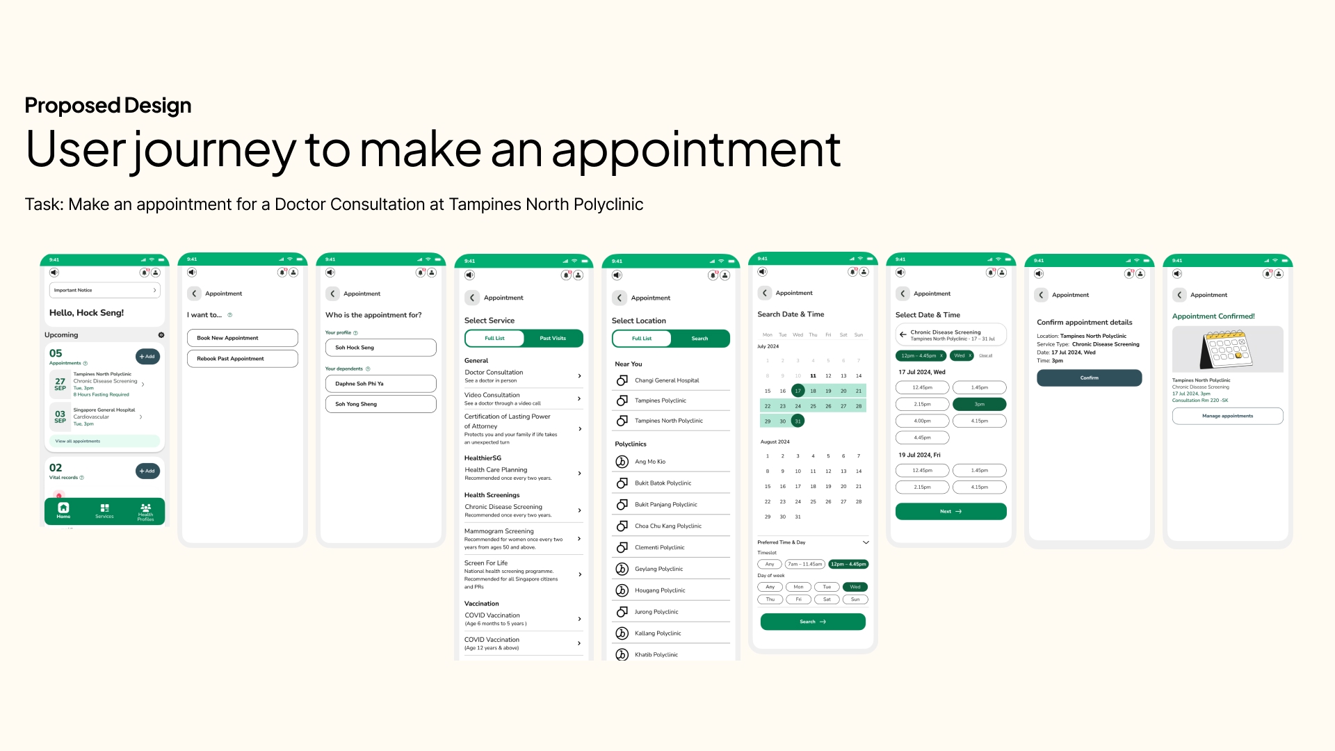 Through usability observations, I identified key friction points in how users search for polyclinics and available appointment times. The redesign streamlines both processes to reduce effort, confusion, and unnecessary trial-and-error.