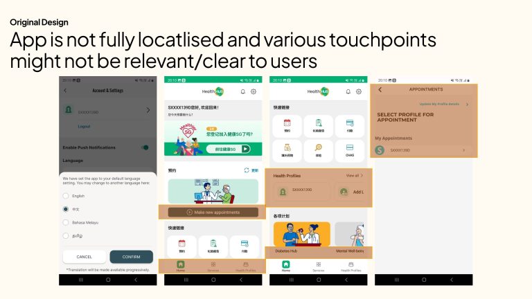 HealthHub offers language preferences such as Mandarin, Malay, and Tamil, but the translation is only partial—leaving users to navigate a mix of English and their preferred language. For seniors less fluent in English, this inconsistency makes the experience feel disjointed and inaccessible.
