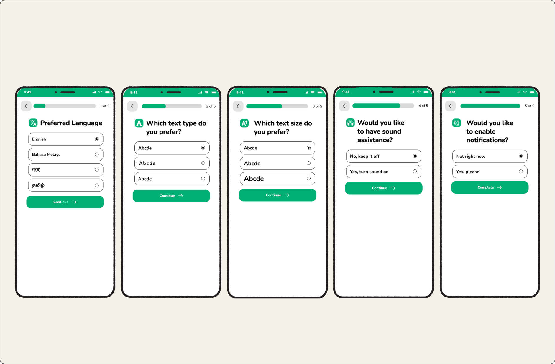 To make HealthHub truly inclusive, I proposed the introduction of personalisation settings that adapt to diverse access needs. These options would be prompted during first-time use, and remain accessible anytime through the app’s settings panel.