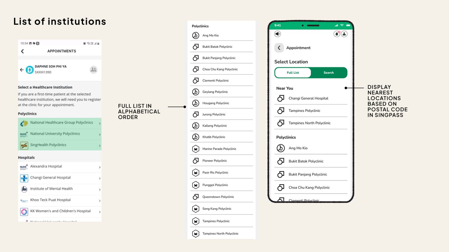 A new ‘Near You’ section automatically highlights the nearest healthcare institutions based on the user’s postal code (retrieved from Singpass), allowing quick selection without manual searching.