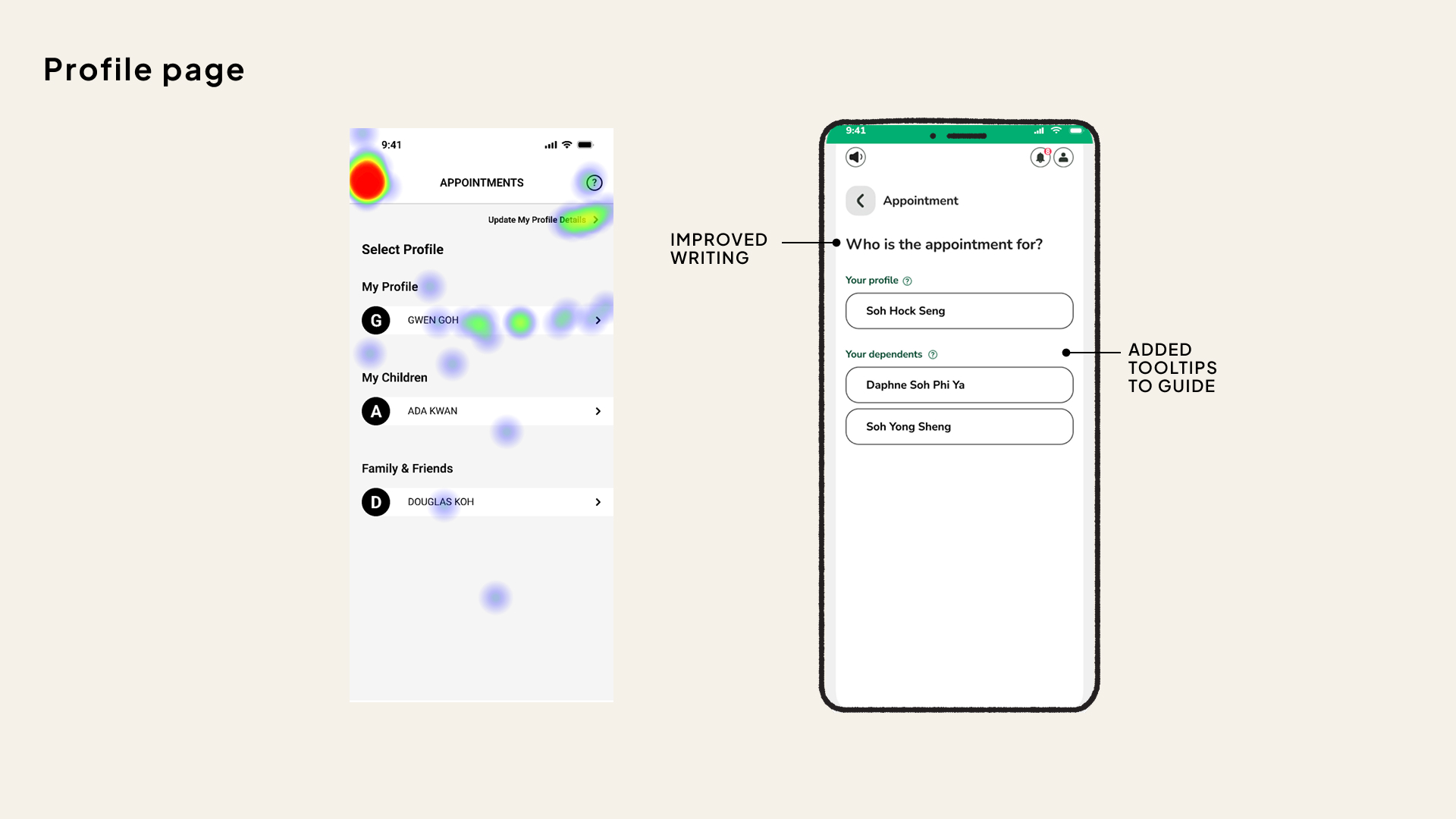 The screen title was updated to “Who is the appointment for?” to clearly convey the function of the page and reduce cognitive ambiguity.Added Tooltips